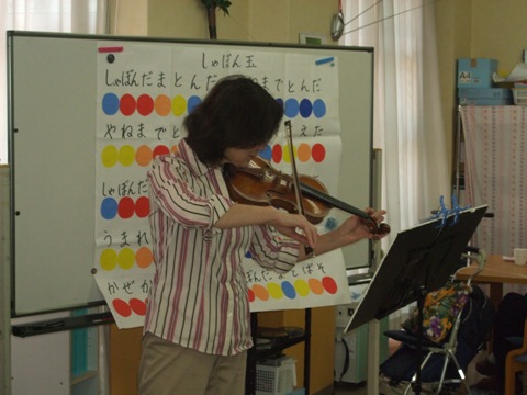 ヴァイオリンを弾く白石先生です。曲は、「みかんの花咲く丘」です。