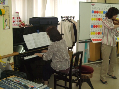 伴奏でピアノを弾いている音森先生。ピアノとヴァイオリンの生の音、素敵ですね