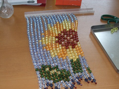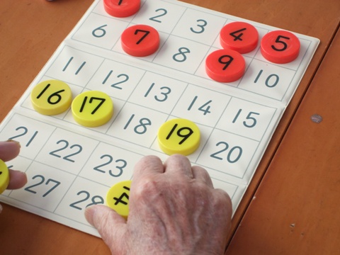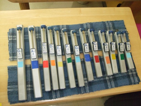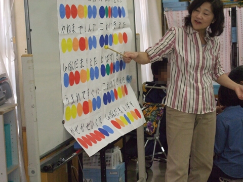 色分けしてあるので先生の「あお、みどり、あか、あお、みずいろ」といった声に合わせて。