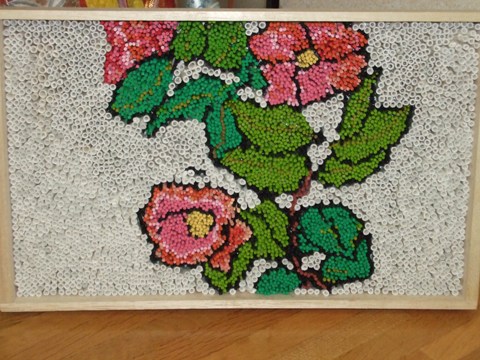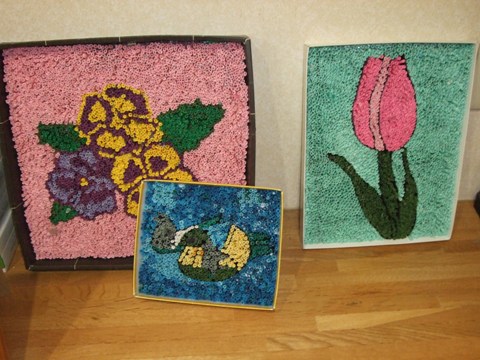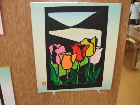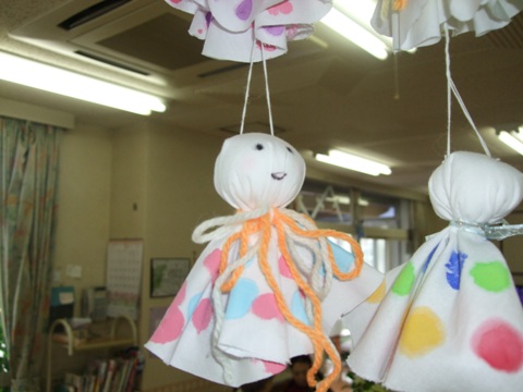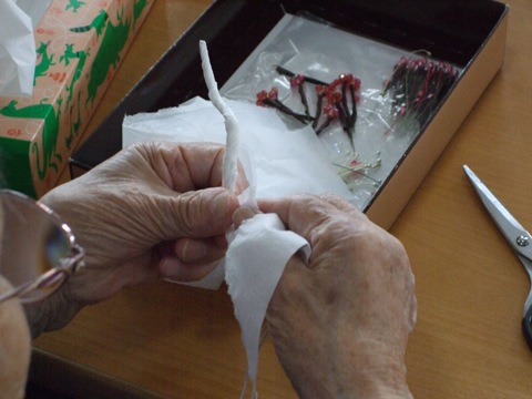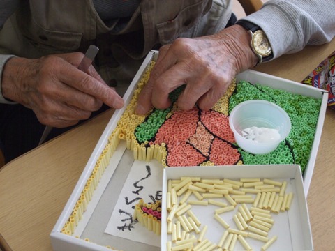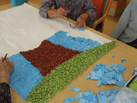 半紙に色をつけての作品づくり、丸めているのは、お花紙。