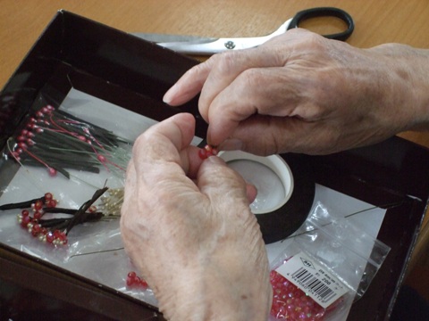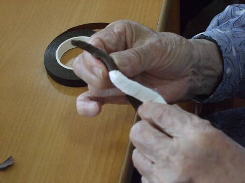 茶色いテープを巻いていきます。できるところは利用者様にしていただき、難しいところはスタッフが手伝っています。