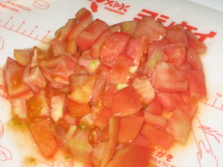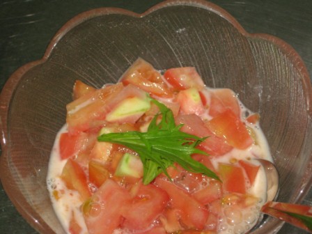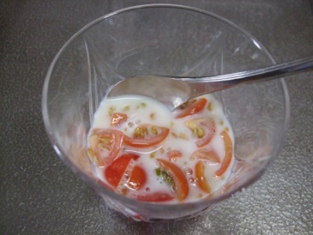 トマトをさいの目に切って、砂糖を適当に混ぜ牛乳を入れて