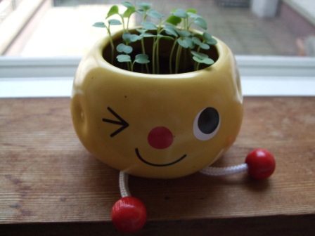 本部にお越しの方は2階に上がって入り口を入った窓際にも、じゃがいものポットで可愛らしいハーブ(ルッコラ)を育てています