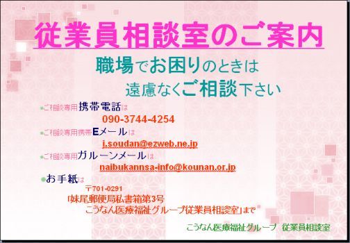 また、内部監査室は従業員相談窓口も兼ねておりますので、職員の皆様の中で何か悩み事のある方や相談したいことがある!という方がおられましたら、是非お気軽にお尋ね下さい。